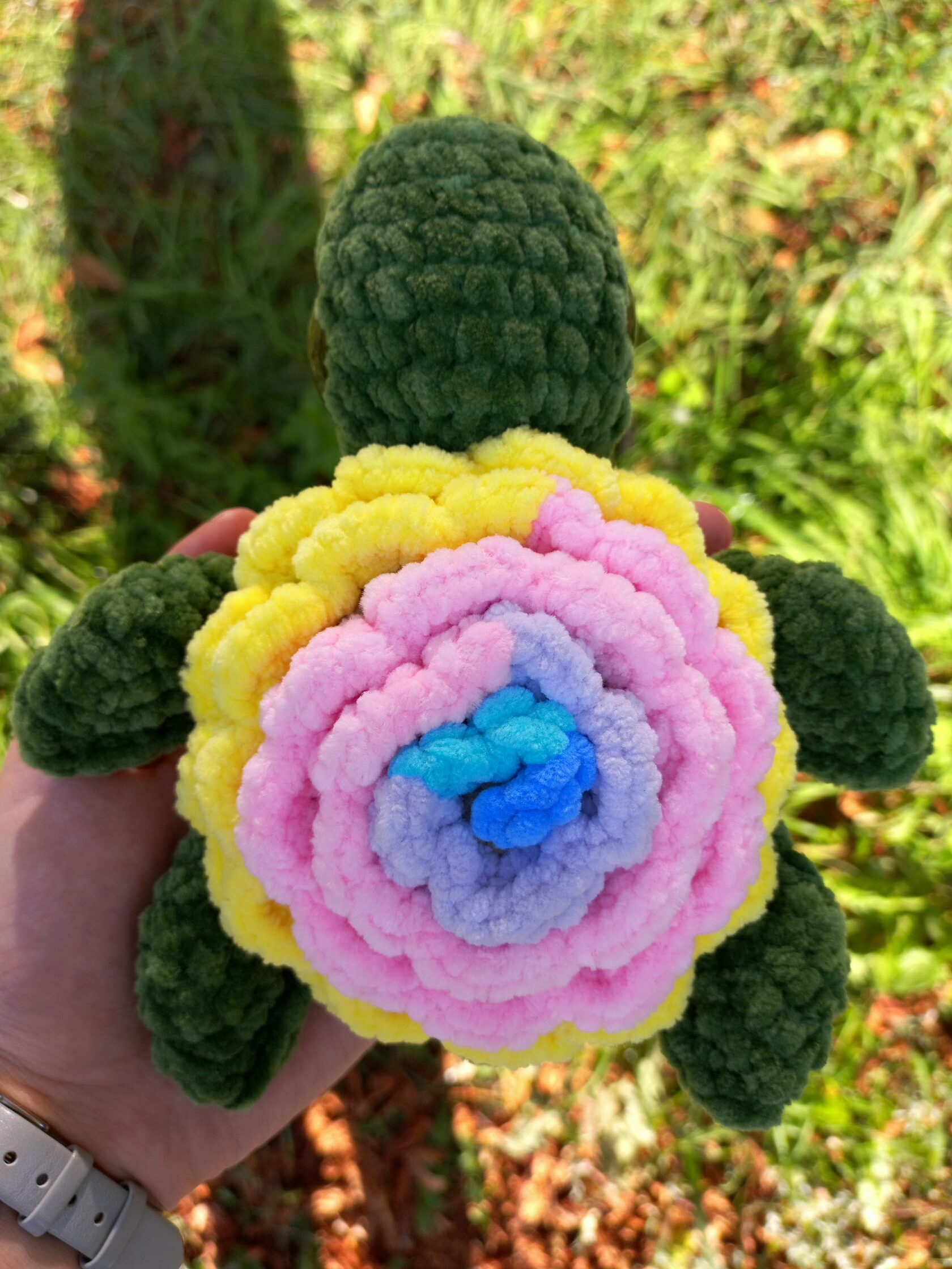Сам процесс вязания не занял много времени. Усилий требовали закрепления глаз диаметром 30 мм. А также несколько раз пришлось заново начинать вязание лепестков цветка.